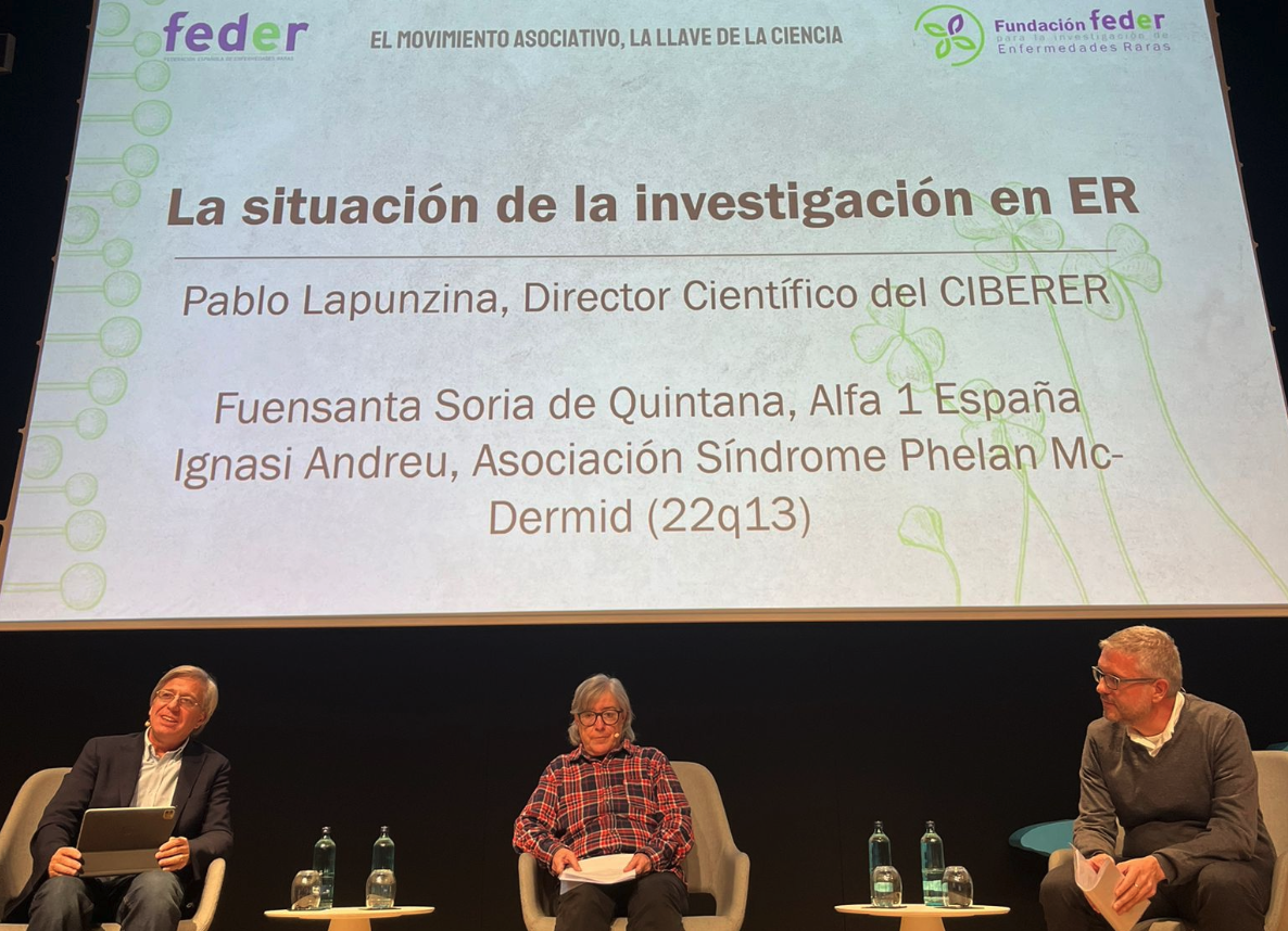 Durante el acto, la Federación Española de Enfermedades Raras (FEDER) y su Fundación presentaron, a nivel público, los datos que evidencian el valor que aportan las asociaciones de pacientes a la investigación en enfermedades raras. Nuestra entidad tuvo el honor de formar parte de la mesa de debate “La realidad de la investigación en enfermedades raras”, moderada por Pablo Lapunzina, Director Científico CIBERER, para destacar la urgencia de la investigación como la principal esperanza de las familias con personas afectadas por el síndrome de Phelan-McDermid y otras enfermedades poco comunes.